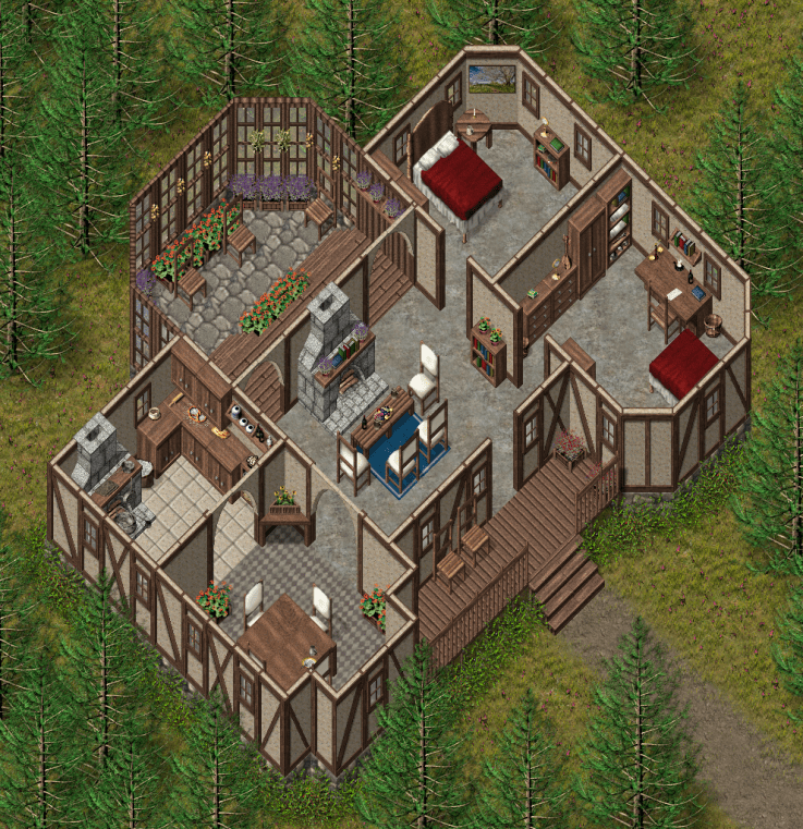 The first tutorial creates the interior of this house, and includes all setup to create the map and layers inside of GIMP, as well as the Addons and Setup to make this a playable map in RPG Maker MV. The second tutorial is my way of adding a non-standard roof to a building, and also includes the “disappearing roof” which is actually simple after going through the first tutorial.