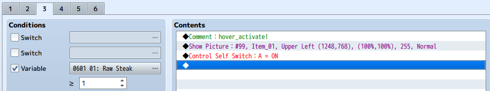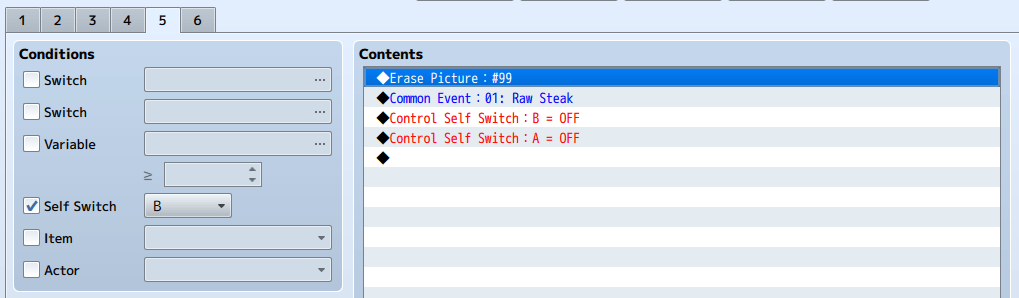 In this case, I start by Erasing the Tooltip image. Then I called a common event to actually perform the action related to the event, in this case, eating the raw steak. Finally, I turn off Self Switch B to stop the AUTORUN and prevent it from looping, then turn off Self Switch A to reset the event to be ready for the mouse to move over it again.