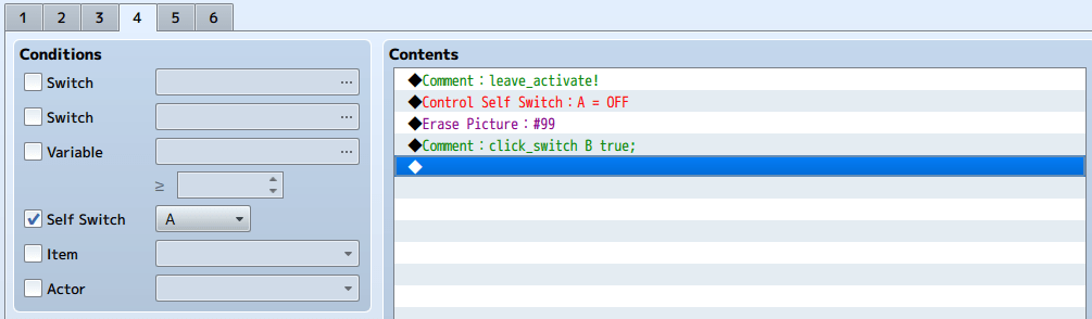 This event also has the “click_switch B true;” comment line. With this, if the mouse button is clicked while the mouse is over the event, Self Switch B gets turned on.